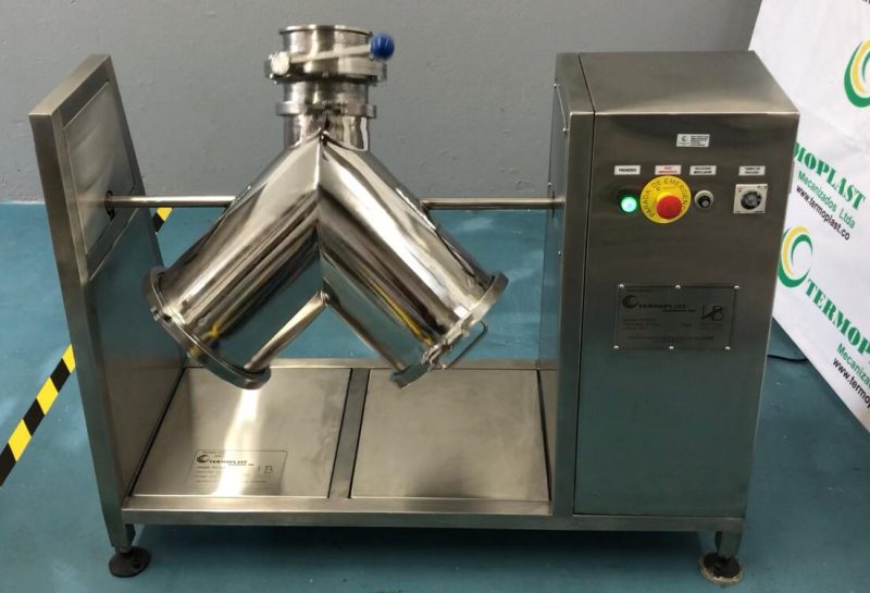 Fabricación de mezclador en V con capacidades desde 5 litros para pruebas piloto hasta 2.000 litros para procesos industriales, fabricados en acero inoxidable calidad 316 L el material que va en contacto con el producto y 304 material que no va en contacto con el producto, con elementos eléctricos y electrónicos de marcas reconocidas como siemens SEW EURODRIVE, Omron. Cumplimiento de GMP, en la parte eléctrica normatividad RETIE, y en validación de software si el cliente lo exige cumple CFR 21 parte 11. El mezclador en V es usado en la fase de mezcla homogénea y fluidez en sólidos, granulado o polvo de fácil manejo, fácil limpieza eliminando cualquier punto muerto por donde el producto va a estar en contacto.